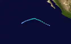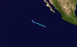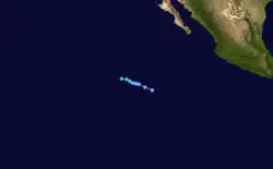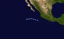 A tropical wave moved off the coast of western Africa into the Atlantic Ocean on August 29. It continued to move westward through the tropical waters of the Atlantic into the Caribbean. It still remained a tropical wave as it moved over Central America and began to acquire more convection and organization, from September 10 through September 11. Visible satellite imagery showed low level circulation and more organized deep convection as it became a tropical depression on September 17, while located about 475 miles (764 km) south-southeast of the southern tip of the Baja California Peninsula.[30]