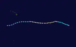 Dora weakened to Category 1 strength as it entered the Central Pacific Hurricane Center's area of responsibility on August 14. However, it briefly restrengthened into a Category 3 as it passed south of Hawaii on August 16. Dora then began weakening for the final time as it passed south of Johnston Atoll on August 18.[20] At the atoll, Dora produced large waves and wind gusts between 40 and 45 mph (64 and 72 km/h).[5] In Hawaii, heavy surf on the Big Island forced the closure of beaches, campsites, and hiking trails in the districts of Kau and Puna.[21] On August 20, Dora crossed the International Date Line,[5] while weakening to a tropical storm. Due to vertical wind shear, it did not re-strengthen in the western Pacific basin. The storm weakened more, falling to tropical depression intensity early on August 22. Dora dissipated late on the following day, while situated several hundred miles east of Wake Island.[20]