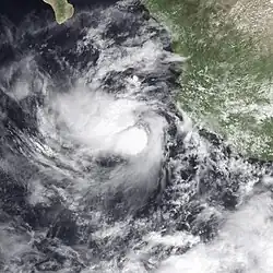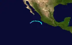 Early on October 9, the center of the storm passed within about 85 miles (137 km) of the coastline between Manzanillo and Cabo Corrientes.[31] The storm then curved west-northwestward and at 1800 UTC on October 9, Irwin attained peaked with winds of 60 mph (97 km/h). Stable air and increasing wind shear caused Irwin to weaken and fall to tropical depression intensity early on October 11. About 12 hours later, the storm dissipated while located about 405 miles (652 km) southwest of Cabo San Lucas.[31] While passing offshore, Irwin brought patches of heavy rainfall to some areas of Mexico, peaking at 9.92 inches (252 mm) in Coahuayutla de Guerrero, Guerrero.[12]