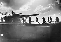 5th Brigade was sent up to the front as reinforcements when the German Spring Offensive opened on 21 March 1918, but the batteries were soon caught up in the 'Great Retreat'. The brigade got back without losing a gun to Villers-Bretonneux, where the Germans were halted.[46] The battery participated in the Battle of Amiens that launched the Allies' Hundred Days Offensive. In the subsequent advance the battery used captured heavy howitzers in addition to its own.[46][47][48] It supported the assault crossing of the St Quentin Canal that broke open the Hindenburg Line on 29 September.[46][49][50] Its last operation was to support the New Zealand Division in capturing the old fortress of Le Quesnoy on 4 November.[46][51]
