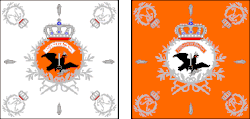 Prussian Infantry regiments before 1806 had two official types of 'regimental colours', the Life Flag, which consisted of a white field and silver decorations. The orange medallion had a black eagle and a white scroll bearing the gold motto "Pro Gloria et Patria", "For Glory and Fatherland". The company flag consisted of an orange field and silver decorations. The white medallion had a black eagle surmounted by an orange scroll with the same model as above in gold.[2]