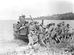 A period of leave followed for the regiment's personnel, after which they rejoined the unit at Warwick, Queensland, before moving to Strathpine, where they joined the rest of the 7th Division's artillery.[11] By this stage in the war there were limited combat opportunities for Australian forces around this time, as US forces had taken over as the main combat force in the Pacific.[12] As a result, a long period of training followed, while Australian troops waited for a new operation. In August, the regiment moved to the Atherton Tablelands, where further training was carried out. Finally, late in the war, the 7th Division was assigned a role in the recapture of Borneo, specifically the landing at Balikpapan.[13] Within this effort, the 2/5th was allocated to support the 21st Brigade. Arriving at Morotai Island in June 1945, the 9th Battery led the regiment ashore in the first wave on 1 July, along with regimental headquarters, which temporarily commanded the divisional fire support assets until the divisional headquarters could land. After the remainder of the regiment arrived, they provided support to the 21st Brigade as advanced to capture the Manggar airstrip.[11] Major combat operations were concluded by 22 July.[14] After this, the regiment sent out patrols, assisting the infantry with local security operations.[11]