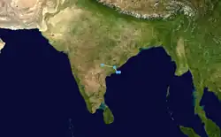 In late August, the monsoon trough spawned a series of disturbances in the Bay of Bengal, including one that developed on August 19 off the Odisha coast. It persisted and gradually organized,[7] becoming a well-marked low-pressure area on August 22. On the following day, the system became a depression,[4] located about 150 km (90 mi) south-southeast of Visakhapatnam, Andhra Pradesh.[7] Moving westward, the system soon moved ashore near Kakinada without intensifying beyond winds of 45 km/h (30 mph), and quickly weakened into a remnant low on August 24. The low continued westward, eventually dissipating over Gujarat on August 28.[4]