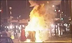 Rioting continued into the early hours of the following morning. Over the course of the night, 26 cars were burnt out,[8] two police officers and two journalists were severely injured, and a shop was set alight. Both police officers and members of the public were pelted with bottles and bricks.[3][9] 23 police officers were later reported to have injured.[10]
