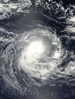 While moving through Seychelles, the storm produced a microburst that lasted for two hours across several islands, producing wind gusts up to 130 km/h (81 mph) on Praslin. Heavy rainfall affected Praslin, La Digue, and particularly Mahé, which reported 327.1 mm (12.88 in) in a 24‑hour period. Damage on Mahé was limited to landslides and some flooding. On Praslin, high winds damaged the roofs of over 50 houses and destroyed six homes, while the airport was also damaged. The winds damaged 50 power lines, causing an island-wide power outage. High winds also downed about 30,000 trees,[10] which blocked roads but were quickly removed.[11] Due to widespread tree damage, Cousin Island—a nature preserve—was closed for about two weeks, accounting for about $50,000 (2002 USD, SR250,000 rupees) in damage.[10] Nationwide, the storm left 375 families homeless and damaged crop fields,[8] becoming the most damaging in the country in 50 years.[10]