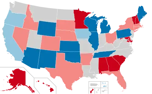 Going into the elections, Republicans held the governorships of 27 states and one territory (that being the Northern Mariana Islands); Democrats held those of twenty-one states, four territories, and the mayorship of the District of Columbia; and two governorships were held by incumbents of neither party (those being Angus King (I-Me.) and Jesse Ventura (IPM-Minn.)). Following the elections, Republicans sustained a net loss of one state governorship (but did gain the governorship of the territory of Guam); Democrats had an overall net gain of three state governorships and held on to all other territorial governorships and the mayorship of the District of Columbia; and there would be no governorships held by independents or third parties. Thus, the balance of power (excluding nonstate entities) would change from a 27–21 Republican majority to a 26–24 Republican majority.