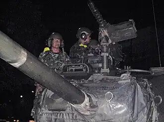 The army declared martial law nationwide, ordered all soldiers to report to their barracks and banned troop movements unauthorised by the CDR.[21] Television footage showed heavily armed troops in M113 armored personnel carriers and M998 HMMWV vehicles on the streets of the city. Many soldiers and military vehicles wore strips of yellow cloth as a symbol of loyalty to the king, whose royal color is yellow.