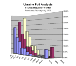 3. ^ Razumkov Centre: 8 лютого 2006 Наміри голосування на виборах до Верховної Ради України та ідеологічні орієнтації громадян (Центр ім.О. Разумков) (Conducted 26–31 January 2006, published 8 February, Ukrainian only, edited)