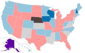 Democrats flipped ten legislative chambers. Democrats gained control of the Oregon House of Representatives, the Minnesota House of Representatives, both houses of the Iowa General Assembly, and both houses of the New Hampshire General Court for the first time since 1875, giving them complete legislative control over those states. The Iowa Senate was previously tied. Democrats also won majorities in the Wisconsin Senate, the Michigan House of Representatives, the Pennsylvania House of Representatives, and the Indiana House of Representatives, turning those legislatures into split bodies.[1] Additionally, a Democratic-led coalition was created in the Alaska Senate, which was previously a Republican majority.[2] Democrats won a majority of state legislative chambers for the first time since 1995.