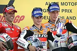 Loris Capirossi, Dani Pedrosa and Nicky Hayden, celebrating on the podium after finishing second, first and third in the MotoGP race.