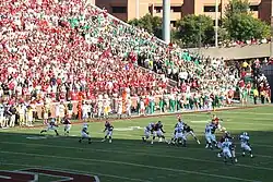 The Mean Green defense against the Sooners with both teams' fans looking on