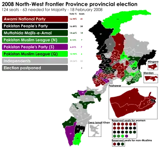 Provincial elections were held in the North-West Frontier Province to elect the members of the 9th Provincial Assembly of North-West Frontier Province on 18 February 2008, alongside nationwide general elections and three other provincial elections in Sindh, Balochistan, and Punjab. The remaining two territories of Pakistan, AJK and Gilgit-Baltistan, were ineligible to vote due to their disputed status. These were the last elections held under the provincial name "North-West Frontier Province", later changed to Khyber Pakhtunkhwa following the Eighteenth Amendment to the Constitution of Pakistan. [1]