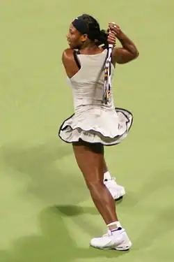 Williams came into the US Open as the world no. 3, and was one of seven contenders to claim the number 1 ranking. Williams was also trying the title for the first time in six years. Williams began her tournament against Ukraine's Kateryna Bondarenko and cruised in straight set. She recorded six aces and won 92 percent of the points on her first serve.[40] Williams, in her second round match took on Russia's Elena Vesnina and won with a double breadstick victory.[41] In the following round, she faced 30th seed Ai Sugiyama and cruised in a 66 minutes straight sets win.[42] In the fourth round, Williams cruised pass French wild card Séverine Brémond in straight sets winning both sets in two.[43] In the final 8, Williams took on sister Venus Williams in their 17th meeting. In the first set Venus had the advantage serving for the set at the tenth game, however younger sister Serena came back to push it to a tie-break. Venus then had two set points in the tie-break, but Serena reeled in four straight points to win the set. In the second set, once again Venus served for the set in the ninth game and had three set points, just to see Serena save them all and save another one at the twelfth game to push to another tie-break. Venus then had another three set points in the tie-break, just to see Serena win 6 of the last 7 points to win the match.[44] In the semifinals, Williams faced French Open finalist Dinara Safina, Safina took an early lead winning the first two games, just to see Williams come back breaking her in the fourth and eight game and served the set out in the ninth game saving two break points. Williams then cruised in the second set winning it in two.[45] In her first final since 2002, Williams took on Jelena Janković for the title and the number 1 ranking. In the first set, Williams took control with a single break lead. The second set was a turn-around, Janković had her chances she had three set points in the Williams serve in the ninth game and served for the set in the tenth game. However, Williams came back and broke Janković in the tenth and twelfth game to win her third US Open title and ninth slam without dropping a set. Williams finished with 44 winners, offsetting her 39 unforced errors, while Janković had 15 winners and 22 unforced errors. The win also gave Williams the number 1 ranking.[46][47]