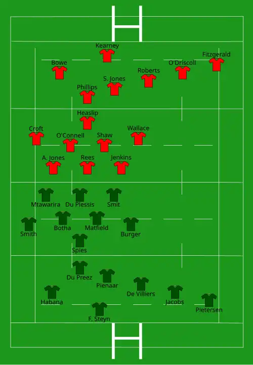 | Try: Frolick 36' c Con: Pretorius Pen: Pretorius 14' | Report[32] | Try: Roberts (2) 6' c, 40' c O'Driscoll 10' c Monye (2) 21' m, 68' c Croft 29' c Bowe (2) 47' c, 57' c Hook 74' c Ferris 80' c Con: S. Jones (6/7) Hook (3/3) Pen: S. Jones (2) 12', 17' |