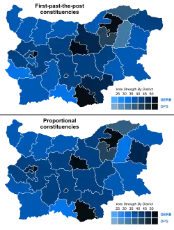 Parliamentary elections were held in Bulgaria on 5 July 2009.[1][2] With 40% of the vote, the decisive winner of the elections was the established in 2006 personalistic party of Boyko Borisov, GERB. The Socialist Party, in power before the election, was in second place, with around 18%. Оnce-ruling National Movement Simeon II did not cross the 4% threshold and won no seats. The turnout was 60.6%, one of the lowest ever. Following the election, GERB leader Boyko Borisov became prime minister. Just like all the previous parliamentary elections since the fall of communism, the government was not re-elected.