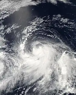 Hurricane Guillermo formed on August 12 from a broad area of low pressure nearly 700 miles (1,100 km) SW of Baja California. The system developed a good series of banding features and convection, and as a result, in the afternoon later that day, it strengthened into a tropical storm, the seventh in the eastern Pacific that year. On August 14, it strengthened to become the fourth hurricane of the season, concurrent to the development of a good, banding type eye. That afternoon, Guillermo strengthened to a Category 2 hurricane with maximum winds increasing to 100 mph (160 km/h). Early on August 15, Guillermo intensified to become the second major hurricane of the season, as it was upgraded by the NHC to a Category 3 hurricane, with maximum winds increasing to 125 mph (201 km/h). On August 16 it crossed into the Central Pacific basin as a Category 1 hurricane, and then quickly weakened to a tropical storm thereafter due to very high wind shear. Despite over very strong as high as 45 mph (72 km/h) of shear, Guillermo survived as a weak tropical storm for a further 3 days before weakening to a depression and degenerating to a remnant low on August 19, near the West Coast. However, the remnants continued to curve towards the northeast for the next several days, before finally dissipating on August 23.[47]