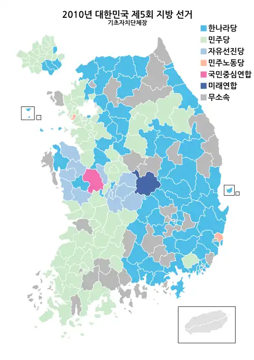 NPP PFU PPP FU PPU Ind. The 5th local elections were held in South Korea on 2 June 2010.[1] The voter turnout reached 54.4%, the highest in 15 years.[2]