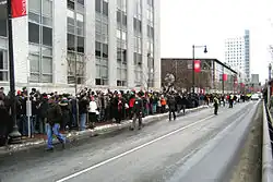 Two of Coakley's ads had to be re-edited after they first aired, one because of a typo in spelling Massachusetts (spelling it Massachusettes), and another which used old stock footage of New York's World Trade Center, destroyed in the September 11 terrorist attacks, to represent Wall Street. The second ad was meant to depict Scott Brown as a Wall Street crony.[87] On January 12, 2010, an altercation occurred between The Weekly Standard journalist John McCormack and Democratic strategist Michael Meehan, in which the journalist was pushed onto the ground while trying to ask Coakley a question.[88][89] Coakley stated she was aware of the incident but unsure of exactly what happened.[90] Meehan later apologized for being "a little too aggressive," while denying any intention to knock down McCormack.[91]