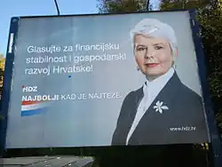 The official campaign began on 17 November and ended on 2 December which was the last day when the candidates could present their ideas to the electorate.[26] Lasting a total of 16 days, this was the shortest campaign in history, although unofficial campaigning started much earlier.[21] Kukuriku coalition toured the country presenting their Plan 21, an open document which they sought to present to the public and urge them to share their ideas and criticisms. Throughout October and November they held multiple open forum type debates all over the country. The main focus of their campaign was the economy and low employment numbers.[27] HDZ entered the campaign handicapped by the investigation against the party's black funds, which was made public by the Mladen Bajić, the Attorney General, only a couple of weeks before the official campaign began.[14] The stagnating economic recovery and high unemployment numbers caused by the policies of the Governments of Ivo Sanader and Jadranka Kosor in the past eight years, as well as multiple corruption scandals and a former leader on trial marked the party's campaign. Their main message was that, while the situation may be difficult, HDZ was a party that was best when things are bad and had proven itself in tough times. The rhetoric was mostly patriotic and focused on largely forgotten themes of the 1990s and Franjo Tuđman, the first leader of HDZ.[28] Due to outdated laws Zoran Milanović and Jadranka Kosor, the only two people with a realistic chance of winning the Premiership, were unable to exchange ideas and arguments in a debate.