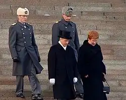 The president's powers were curtailed in the constitutional reform in 2000, and yet further in 2012.[7] Currently the President leads the Finnish foreign policy together with the cabinet. EU affairs, however, fall to the Prime Minister's authority. The President has little domestic power. He or she can dissolve the parliament, but only at the Prime Minister's request. The President can choose not to ratify a bill, but this only returns it to parliament, which must then approve the bill again in order for it to become a law without the President's signature. The President's power to appoint officials has been reduced, but he or she still appoints all military officers as well as judges. The President is the Commander-in-Chief of the Finnish Defence Forces. The President also has the power to pardon anyone convicted of a crime.[8][9][10][11]