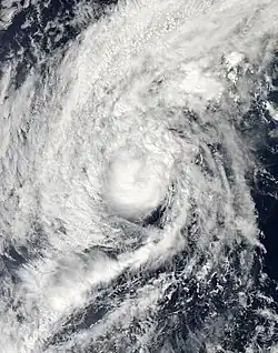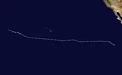 A tropical wave moved off the western coast of Africa on July 9 and crossed Central America on July 18. The disturbance initially lacked a well-defined center until early on July 25 as convection steadily increased, leading the formation of a tropical depression at 00:00 UTC that day; six hours later, the depression strengthened into Tropical Storm Flossie. Steered westward amid a favorable environment, the cyclone steadily intensified, attaining peak winds of 70 mph (115 km/h) at 12:00 UTC on July 27 as an eye became evident on satellite imagery. Flossie crossed into the Central Pacific shortly thereafter, where increasing wind shear prompted a gradual weakening trend. At 00:00 UTC on July 30, the system weakened to a tropical depression; twelve hours later, it degenerated into a remnant low while located near the northern coast of Kauai.[57]