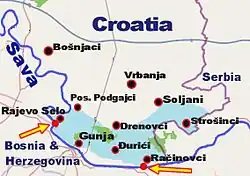 Croatia was affected by the floods to a lesser extent than Serbia or Bosnia.[47] The most critical area was in southern Slavonia. The embankment on the Sava River was breached near Rajevo Selo and Račinovci, and thus evacuation was ordered for Gunja, Rajevo Selo and Račinovci. As of 19 May, around 15,000 people in easternmost parts of Croatia were evacuated from their homes.[48] One of the most critical points was the embankment of the Sava river in Slavonski Šamac, where the confluence of the Bosna and Sava is located. At that point the embankments were under severe pressure caused by the huge amount of water coming from Bosnia. Several officials stated that if this embankment were breached, the entire region of southern Slavonia, with a population of over 300 000, would be flooded.[49] There were also floods in Banovina region, in the towns of Hrvatska Kostajnica and Dvor, mostly caused by the river Una, whose level had not been as high since 1955.[50] Video: http://vimeo.com/96164094