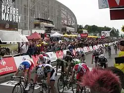 The first stage's bunch sprint finish was won by Marcel Kittel. A crash in the sprint caused Mark Cavendish, a favourite for the win, to fall; he did not start stage two.[42] Kittel gained the race leader's yellow jersey and the green jersey as the leader of the points classification, with Jens Voigt taking the polka dot jersey as the leader of the mountains classification.[43] In the following stage, likened to a "mini Liège-Bastogne-Liège",[44] Vincenzo Nibali took the stage win and yellow jersey, attacking on Sheffield's hilly terrain with 2 km (1.2 mi) remaining. Peter Sagan took the green jersey and Cyril Lemoine (Cofidis) took the polka dot jersey.[45] Stages three and four, finishing in London and Lille respectively, ended in bunch sprints and were both won by Kittel.[46] Crashes in stages four and five forced pre-race favourite Chris Froome to abandon the race; his injuries were later revealed to be fractures to his left wrist and right hand.[47] The weather was wet throughout the fifth stage, with the sett paving causing many crashes (although not Froome's). The fractured ending was won by an attack in the final 5 km (3.1 mi) by Lars Boom of Belkin Pro Cycling. Nibali, who placed third, extended his overall lead over his rivals, with Alberto Contador 2 min 37 s down.[48] André Greipel won stage six's bunch sprint in Reims.[49] Another bunch sprint took place at the end of the next stage, with the hilly finish decided by a photo finish between Sagan and the winner Matteo Trentin (Omega Pharma–Quick-Step).[50]