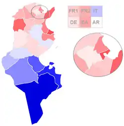 ![]() Map showing the plurality of votes of the parties in each Tunisian governorate. Red voted for Nidaa Tounes and Blue voted for Ennahdha. | |||||||||||||||||||||||||||||||||||||||||||||||||||||||||||||||||||||||||||||