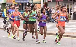 The first runners hit the 3.1-mile (5 km) point in 17:21 and the 6.2-mile (10 km) mark in 34:27.[7] By the halfway point (1:12:54), a nine-woman lead pack had emerged led by Portuguese runner Sara Moreira. They remained together until the 18-mile (29 km) mark, where a group containing Kenyans Mary Jepkosgei Keitany and Priscah Jeptoo, along with Ethiopians Aselefech Mergia and Tigist Tufa started to pull away. At the 20-mile (32 km) mark, Keitany increased her pace and began recording sub 5:20 miles. Tufa kept up with Keitany until the 22-mile (35 km) point before falling away. Keitany won the race in 2:24:25, a full minute and seven seconds in front of second placed Mergia who had overtaken Tufa in the final mile. Tufa trailed a further eighteen seconds behind in third place. Keitany's win marked the first time a woman had defended the New York Marathon title since Briton Paula Radcliffe in 2008.[2]