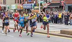 The first runners hit the 3.1-mile (5 km) point in 15:47 and the 6.2-mile (10 km) mark in 31:30.[7] By the halfway point (1:06:49), a thirteen-man lead pack had emerged led by Ethiopian Lelisa Desisa. At the 20-mile (32 km) mark, the lead pack had reduced to four, containing Kenyans Geoffrey Kamworor, Stanley Biwott and Wilson Kipsang Kiprotich, along with Desisa. Biwott took the lead in the 23-mile (37 km) and held on to win his first World Marathon Majors title in 2:10:34. Kamworor was fourteen seconds behind him to claim second and Desisa a further minute 22 seconds off in third.[2]