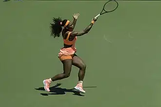 Williams was the top seed and three-time defending champion and hoping to win a calendar year Grand Slam. She started off with Russian Vitalia Diatchenko in the first round where quickly won on the first set, however, Diatchenko retired due to an injury to advance the next round.[64] In the second round, she faced with Dutch Kiki Bertens that lasted in 1 hour and 32 minutes.[65] In the third round, she faced fellow American Bethanie Mattek-Sands where she had a tough momentum that lost on the first set. During the second set, she narrowly avoided upset by Mattek-Sands and quickly regained focus on the third set.[66] In the round of 16, she faced with another fellow American Madison Keys and winning in straight sets.[67] In the quarterfinal stage, she faced her third American opponent in a row, her sister Venus, Serena dominated early in the first set. During the second set, she lost to Venus, and in the third set, she narrowly defeated her sister to advance to the semifinals.[68] In the semifinals, she faced Italy's Roberta Vinci who was on her first Grand Slam singles semifinal. The semifinal match was supposed to play the night before but was delayed due to rain. The odds favored Serena; Vinci had never beaten Serena Williams in all of their four previous meetings, and Serena performed well in the first set. However, she was upset by Vinci and lost the next two sets, ending her bid to win the calendar-year Grand Slam, won last by Steffi Graf in 1988. It was also her first Slam loss since the previous year's Wimbledon.[69]