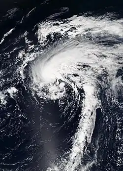A weak area of low pressure developed over northwestern Cuba in association with a stationary front on January 6. The frontal wave intensified as it moved into the central Atlantic, temporarily attaining hurricane-force winds by January 10. Steered by anomalous high pressure, the disturbance turned southeast and tracked over warmer waters. Its associated fronts dissipated, its wind field became more symmetric, and convection increased near the center, leading to the formation of Subtropical Storm Alex by 18:00 UTC on January 12. Despite marginal ocean temperatures, Alex benefited from rapidly cooling upper-air temperatures, and it intensified quickly while turning northeast. The presence of deeper convection near the center and an eye on conventional satellite showcased the storm's transition into a fully tropical cyclone and intensification into a hurricane by 06:00 UTC on January 14. Six hours later, it peaked with maximum sustained winds of 85 mph (135 km/h). Alex turned north after peak, and the storm weakened to a tropical storm before making landfall on Terceira Island, Azores. With decreasing core convection and an impinging warm front, Alex transitioned into an extratropical cyclone by 18:00 UTC on January 15 and was absorbed by a larger extratropical low two days later.[22]