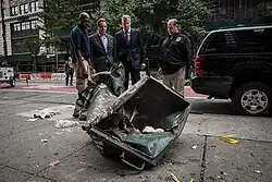 The explosion "was powerful enough to vault a heavy steel dumpster more than 120 feet through the air ... Windows shattered 400 feet from where the explosion went off, and pieces of the bomb were recovered 650 feet away."[13] The explosion caused damage to a nearby five-story brownstone,[1] and debris was strewn in front of the St. Vincent de Paul Church.[14] The moment of the blast was captured on closed-circuit television footage from three cameras.[15]