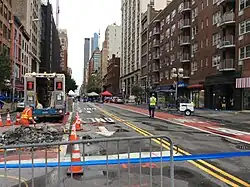 In the Chelsea neighborhood of Manhattan in New York City, on the same day as the Seaside Park bombing, a pressure cooker bomb filled with shrapnel, in the form of small bearings or metal BBs,[6] exploded in a crowded area on West 23rd Street, between Avenue of the Americas and Seventh Avenue at 8:31 p.m.[1][6][7] The explosion occurred in front of 133 West 23rd Street[8] in the vicinity of a construction site,[9] at which materials were in place for exterior renovations of the Visions at Selis Manor facility, an apartment building for the blind, at 135 West 23rd Street.[10][11] Other nearby buildings included the Townhouse Inn of Chelsea,[11] and many restaurants. The Chelsea neighborhood is primarily residential, and has an active nightlife scene.[12]