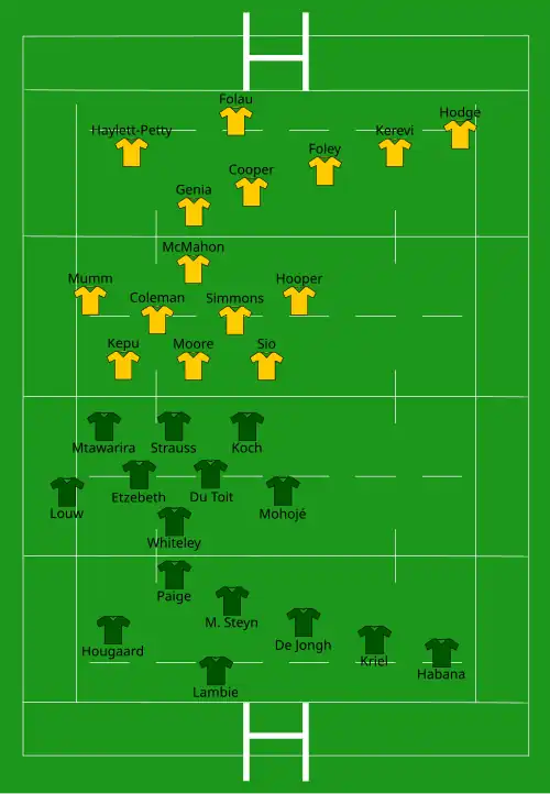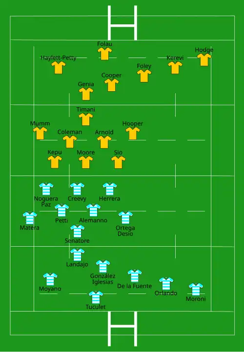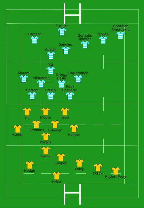 After a week's break Argentina traveled to New Zealand and following a competitive first half dropped away to lose 57–22. Argentina took the lead after only two minutes as Cordero scored under the posts from the opening passage of play. However, New Zealand struck straight back with a Julian Savea try. Ben Smith and Barrett also scored for New Zealand while Sanchez's four penalties kept Argentina close, with New Zealand leading 24–19 at half time. The second half was all New Zealand as they scored five tries to Ben Smith, Charlie Faumuina, Luke Romano and Crotty twice against a solitary penalty from Sanchez.[16] Australia hosted South Africa, ending a six match losing streak after clinching a 23–17 victory in the wet at Brisbane. Only one point separated the two teams at the half time break. Whiteley and Goosen had scored tries early for South Africa to give them the lead, while an Adam Coleman try and two Foley penalties brought Australia to within one point. Early in the second half South African lock Eben Etzebeth was sin binned for a dangerous challenge and Foley kicked the resulting penalty to give Australia a slight lead. Foley then scored the decisive try 20 minutes later to give them their first win of the tournament.[17]