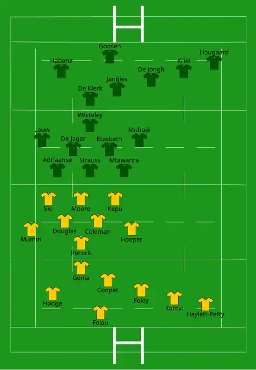 1 Trevor Nyakane was initially included pending medical clearance. However, his ankle injury ruled him out of the first two matches of the Rugby Championship and he was replaced by Lourens Adriaanse.[53]