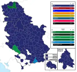 After the polls closed, it soon became clear that the Serbian Progressive Party would maintain its absolute majority in the Assembly, albeit with a smaller number of MPs, and that their partners, the Socialist Party of Serbia, would maintain their standing. However, the Republic Electoral Commission (RIK) and organizations monitoring the election (such as CeSID) were cautious about the results of most other lists, as they hovered around the 5% threshold. For a while, it looked as if all seven main contestants would pass the threshold, but as the Commission published the final results on Thursday 28 April, the DSS-Dveri coalition ended up a single vote short. Tensions ran high, as the participants started to accuse each other and the Commission of fraud, which along with demolition of Savamala resulted in protests.[33][34] Still, there were additional 18,000 votes to share, as voting had to be repeated at 15 polling stations due to irregularities.[35] In the re-run held on 4 May, DSS–Dveri comfortably won the required number of votes and ended up with 5.03% of the electorate.[33] The Electoral Commission released the final results of the election on Thursday 5 May.