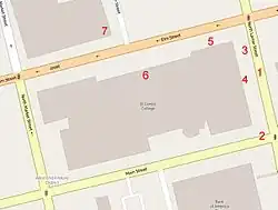 Most of the events happened in the streets and buildings around El Centro College, which forms a city block composed of multiple buildings. The block is bordered by Main Street on the south where the protest march was taking place; Lamar Street (now Botham Jean Blvd.) to the east from where Johnson initiated the shooting spree; and Elm Street to the north where Johnson eventually entered the college.[26]