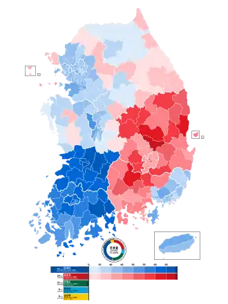 | Gwangju | 583,847 | 61.1 | 14,882 | 1.6 | 287,222 | 30.1 | 20,862 | 2.2 | 43,719 | 4.6 |
