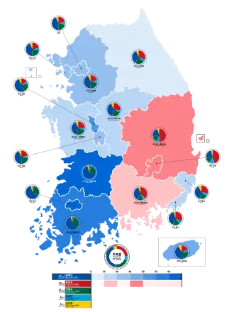 | South Jeolla | 737,921 | 59.9 | 30,221 | 2.5 | 378,179 | 30.7 | 25,819 | 2.1 | 49,509 | 4.0 |