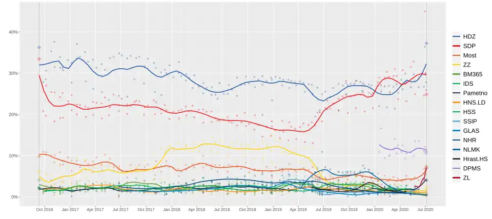 In the elections the ruling Christian-democratic HDZ faced its main challenge from the centre-left Restart Coalition chaired by SDP leader Davor Bernardić, which consisted of the SDP and several smaller parties (such as the Croatian Peasant Party, Civic-Liberal Alliance, Croatian Party of Pensioners and Istrian Democratic Assembly).[10][11] Opinion polls suggested that a conservative coalition led by 2019 presidential candidate Miroslav Škoro and of Škoro's Homeland Movement party, some of the parties of the Croatian Sovereignists coalition and several other smaller right-wing parties,[12] would become the third-largest grouping in parliament, while the centre-right Bridge of Independent Lists (Most) – which finished a strong third in both the 2015 and 2016 elections, and which had supported Škoro's presidential campaign, could be reduced to the role of a minor parliamentary party.