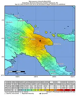 3. ^ a b c d e Public Domain This article incorporates text from this source, which is in the public domain: "M 7.6 – 67 km E of Kainantu, Papua New Guinea". United States Geological Survey. 10 September 2022. Archived from the original on 11 September 2022. Retrieved 11 September 2022.