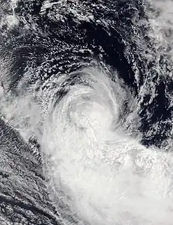 On 25 January, Severe Tropical Cyclone Anggrek moved into the basin from the Australian region and was classified as a tropical cyclone.[64] Anggrek strengthened into a Category 3 equivalent cyclone around 09:00 UTC on 26 January, after eye had emerged on satellite imagery, surrounded by a ring of −112 °F (−80 °C) cloud tops.[65] Six hours later, the cyclone maintained a well-defined eye, and the MFR later upgraded the system to an intense tropical cyclone.[66] The cyclone was highly compact, with a distinct eye. The cyclone weakened and bottomed out at 165 km/h (105 mph) on 28 January.[67] Later the next day, the JTWC stated that Anggrek peaked with one-minute sustained winds of 220 km/h (140 mph)—equivalent to a Category 4 hurricane.[68] Around the same time, the convection decreasingly organized and wrapped around the LLCC.[69] The system was moving quickly southeastwards, steered by a ridge to its east.[70] Shortly afterward, Anggrek's cloud pattern slightly deteriorated; it then weakened due to strong wind shear.[71] Soon after, Anggrek's eye gradually disappeared from infrared and visible satellite imagery.[72] The MFR issued its last advisory on the storm as the convective structure weakened further at 18:00 UTC on 30 January. Later the next day, the JTWC discontinued warnings.[73][74]