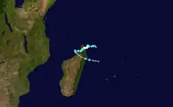 On 13 May, the Joint Typhoon Warning Center began monitoring a low-level circulation which persisted 588 nm east-northeast of Comoros, stating it was in a favourable environment to intensify.[122] Two days later, the JTWC upgraded its chance of developing to medium as the circulation consolidated.[123] By 16 May, the JTWC issued a TCFA on the burgeoning system, stating that deep convection was occurring on the southern portion of the system.[124] Soon after, the MFR recognized the circulation as a zone of disturbed weather.[125] Soon afterwards, the MMS received the name Ialy after the agency upgraded the system into a tropical storm. The JTWC then also recognised the system as a cyclone, issuing warnings on it as Tropical Cyclone 24S.[126] Steadily intensifying, Ialy reached an initial peak intensity with 1-minute sustained winds of 45 kn (50 mph) the next day before wind shear began eroding the system.[127] On May 19, Ialy was upgraded into a severe tropical storm by the MFR as the system became more compact.[128][129] Ialy battled through high shear and became a Tropical Cyclone per MFR and a Category 1-equivalent cyclone per JTWC during the afternoon of May 21 local time.[130][131] However, shear rapidly overcame Ialy, and 24 hours after peaking, Ialy had degenerated into a weak low pressure system per MFR. [132] The JTWC also issued their final warning early on May 22 as Ialy was about to fall below tropical storm strength and was starting to rapidly dissipate just offshore Kenya.[133]
