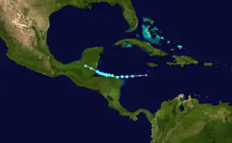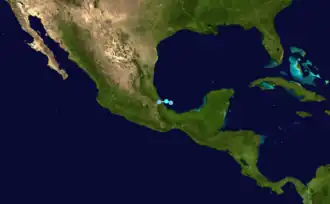 A tropical wave emerged into the Atlantic from Africa's west coast of June 20. Moving generally westward for several days, the wave crossed the Windward Islands on June 25 and then traversed the Caribbean through June 28. By then, the wave slowed and an area of low pressure developed, one day before striking the Yucatán Peninsula. After entering the Bay of Campeche on June 30, the low organized into a tropical depression around 18:00 UTC about 65 mi (105 km) northeast of Veracruz, Veracruz. Warm seas allowed the depression to intensify into Tropical Storm Chris at 00:00 UTC on July 1. However, just three hours later, Chris made landfall in Alto Lucero, Veracruz, with winds of 45 mph (75 km/h) and a minimum pressure of 1,005 mbar (29.7 inHg). The cyclone rapidly weakened and dissipated late on July 1.[36]
