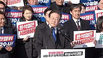 In September 2024, three months before the martial law declaration, some DPK politicians began suggesting that Yoon was preparing martial law. Party leader Lee Jae Myung alluded to "speculation about martial law preparations" in his remark, saying that Yoon appointing Kim Yong-hyun as Defense Minister was a part of a martial law strategy to prevent Kim Keon-hee from going to prison.[23] Kim Min-seok, member of the party's Supreme Council, stated "I have well-founded reasons to believe that the conservative Yoon administration is drawing up a contingency plan to declare martial law".[24][25] The Presidential Office dismissed this claim as "groundless".[26] People Power Party floor leader Choo Kyung-ho also denied the possibility of martial law, saying "Such theories ... are no more than scare tactics and propaganda based purely on imagination".[23]