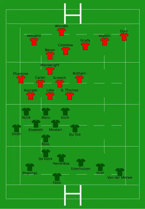 The two teams named their line-ups for this game on 18 June. South Africa were missing their usual captain Siya Kolisi as well as the rest of their Europe-based players, so Pieter-Steph du Toit led the team. They were also without the Bulls players who had reached the final of the 2023–24 United Rugby Championship play-offs, resulting in debut starts for fly-half Jordan Hendrikse and wing Edwill van der Merwe, while uncapped lock Ben-Jason Dixon and utility back Sacha Feinberg-Mngomezulu were named on the bench. Prop Vincent Koch was named in the starting line-up to earn his 50th cap. For Wales, flanker Jac Morgan, who had co-captained the team with Dewi Lake at the 2023 Rugby World Cup, was ruled out of the tour with a hamstring injury, so Lake was named as captain, while James Botham filled in for Morgan in the back row after only being called up to the squad the day before. Lock James Ratti was also called up due to the unavailability of Cory Hill and named on the bench.[5] New Scarlets signing Henry Thomas was named to start the match, but pulled out on 20 June with a foot injury; Keiron Assiratti was promoted from the bench to replace him among the starters, while Scarlets teammate Harri O'Connor came onto the bench.[6]