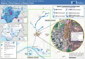 NEMA said 3,534 residents were displaced while local media reported at least 5,000.[23][24][8] The displaced people face rising health risks from cholera, typhoid fever and malnutrition.[18] Critical infrastructure and more than 10,000 ha (25,000 acres) of paddy fields and croplands have been destroyed as well, affecting regional food supply chains.[8][25] The flooding destroyed property worth millions of naira.[11] A thousand people were reported missing,[26] including a family of 12 where only four members were accounted for and all 100 children from a madrasa.[27][14][9] The number of missing people was later revised to over 600 as 500 people were confirmed dead.[18] More than 4,000 houses were destroyed.[18] NEMA provided food and non-food relief items including rice, blankets, and mats.[11]