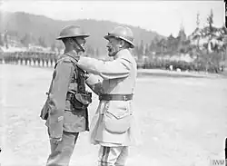 The planned move to France was cancelled and an attack on the Piave front was to be mounted in its place with the 7th and 23rd British divisions, for which the training remained appropriate. The division took its place in the line on the right bank of the Piave river on 21 October, where the river runs in braided channels over one mile wide around an island, Grave di Papadopoli, which the Austrians used as a post in front of their main line.[59] On the night of 25–26 October the 8th Yorkshire Regiment captured the northern part of the Grave, troops from the 7th division the southern part.[60] The 68th and 69th brigades crossed the river on 27 October, and the planned 3000 yard advance was achieved in spite of the division's left flank being unsupported by the 58th Italian division which could not cross the river.[61] The Austrians were, however, demoralised and were retreating behind a rear-guard. The next day the divisions advance of 3,500 yards was done by mid afternoon, during which Pte. Wilfred Wood of the 10th Northumberland Fusiliers won the V.C. for subduing a machine gun nest.[62] Early on 28 October the river Monticano was crossed by the 69th brigade, and in securing the bridgehead (amongst other actions) Sgt William McNally of the 8th Yorkshire Regiment won the division's ninth and last V.C.. Stiffening resistance meant the day's advance was much less than expected.[63] By the afternoon of 31 October the 69th brigade was in the town of Sacile some 15 miles from the Piave, where the last shot was fired by the division.[64] The advance continued through the remains of Austrian columns attacked by aircraft, until the armistice signed on 3 November came into effect the next day, by which time the division was east of the river Tagliamento.[65]