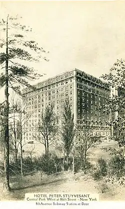 - ^ The post card reads, "The PETER STUYVESANT, an outstanding residential hotel of the upper West Side, commands a beautiful vista of Central Part at 86th Street. The hotel has large single rooms and suites designed for occupancy of those who demand space and comfort. It has an excellent a la carte dining room, where choice wines and liquors are served, and a most attractive Sidewalk Cafe."